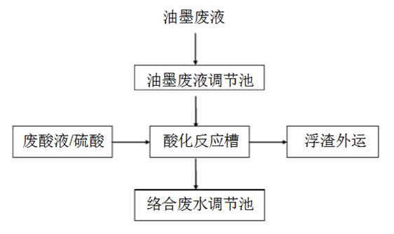 油墨廢液的主要成份為含羥基的樹(shù)脂在堿性條件下所生成的有機(jī)酸鹽,而這些含羥基的樹(shù)脂不易溶于酸性溶液中。應(yīng)用這一基本性質(zhì),在處理顯影、脫膜廢液時(shí)可采取以廢治廢的方法,利用生產(chǎn)車(chē)間排出的廢酸液對(duì)油墨廢液中進(jìn)行酸化處理,不足時(shí)可投加硫酸溶液。