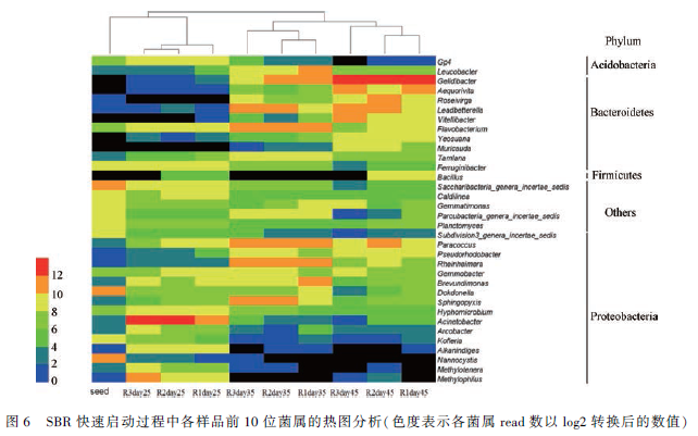 4 組實驗的微生物群落結構熱圖和主成分分析是基于各樣品中含量前10 位菌屬共計34 種菌屬(如圖6 和7 所示)。根據(jù)主成分分析的聚類結果,可以將R1 和R2 的啟動分為3 個階段,這與反應器運行的狀況相吻合。階段(1 ~ 15 d),反應器中活性污泥還處于適應期,進水為普通生活污水,主要以變形菌門中,如不動桿菌屬(Acinetobacter)、布蘭漢氏菌屬(Alkanindiges)、嗜門菌屬(Methylophius)和生絲微菌屬(Hyphomicroblum)等占優(yōu)勢;第二階段(15 ~ 25 d),開始以高鹽廢水為進水,此時鹽度的沖擊負荷使得微生物群落結構反生改變,變形菌門中的微生物豐度進一步增加,并達到較大豐度;第三階段(25 ~ 45 d),經(jīng)過一段時間的運行和馴化,擬桿菌門中,如鳥桿菌屬(Gelidibacter)、黃桿菌屬(Flavobacterium)、碳酸噬胞菌屬(Aequorivita)等逐漸成為優(yōu)勢種屬,而變形菌門中的微生物豐度下降。有趣的是,由于復合菌劑和菌填料的投加,第二階段芽孢桿菌屬(Bacillus) 的豐度上升,并在之后的運行中逐漸成為優(yōu)勢種屬,而這一階段R1 與R2 對TOC 的去除率也遠高于R3,因此,復合菌劑的投加對改善生物工藝有機物去除效果,縮短啟動時間具有顯著的效果。